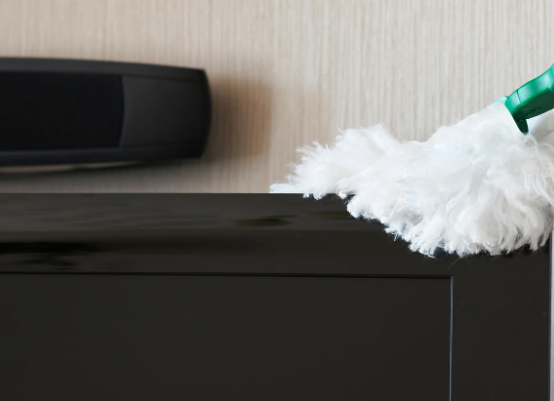 掃除の順序は、ドライワイパーで軽く払ってから掃除機をかけるのが理想的で、ほこりが舞い上がらず、テレビ台の上への戻りも防げます。