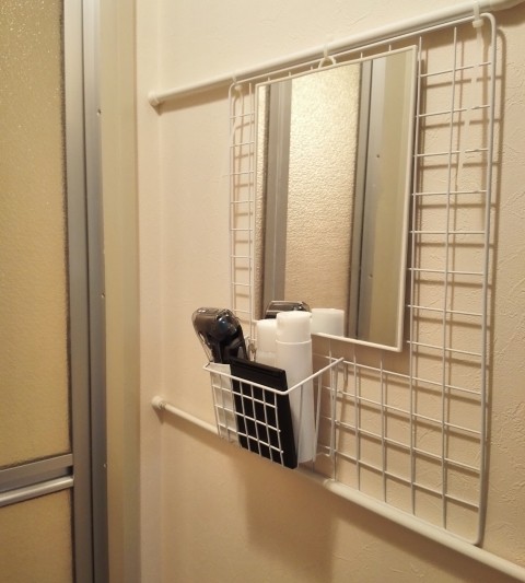 100円ショップでは揃わない場合もありますが、棚を設置するだけで洗濯機上の空間が収納スペースに変わります。ランドリーバッグを置いたり、タオルと分けたりと汎用性が高いアイテムです。