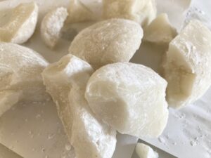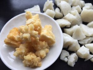 細かい欠片の方がむしろ作りやすく、モチモチ食感でおやつ寄りの食べ方です。時間が経つと固さが出てきますので、できるだけ早く食べるのがおすすめです。